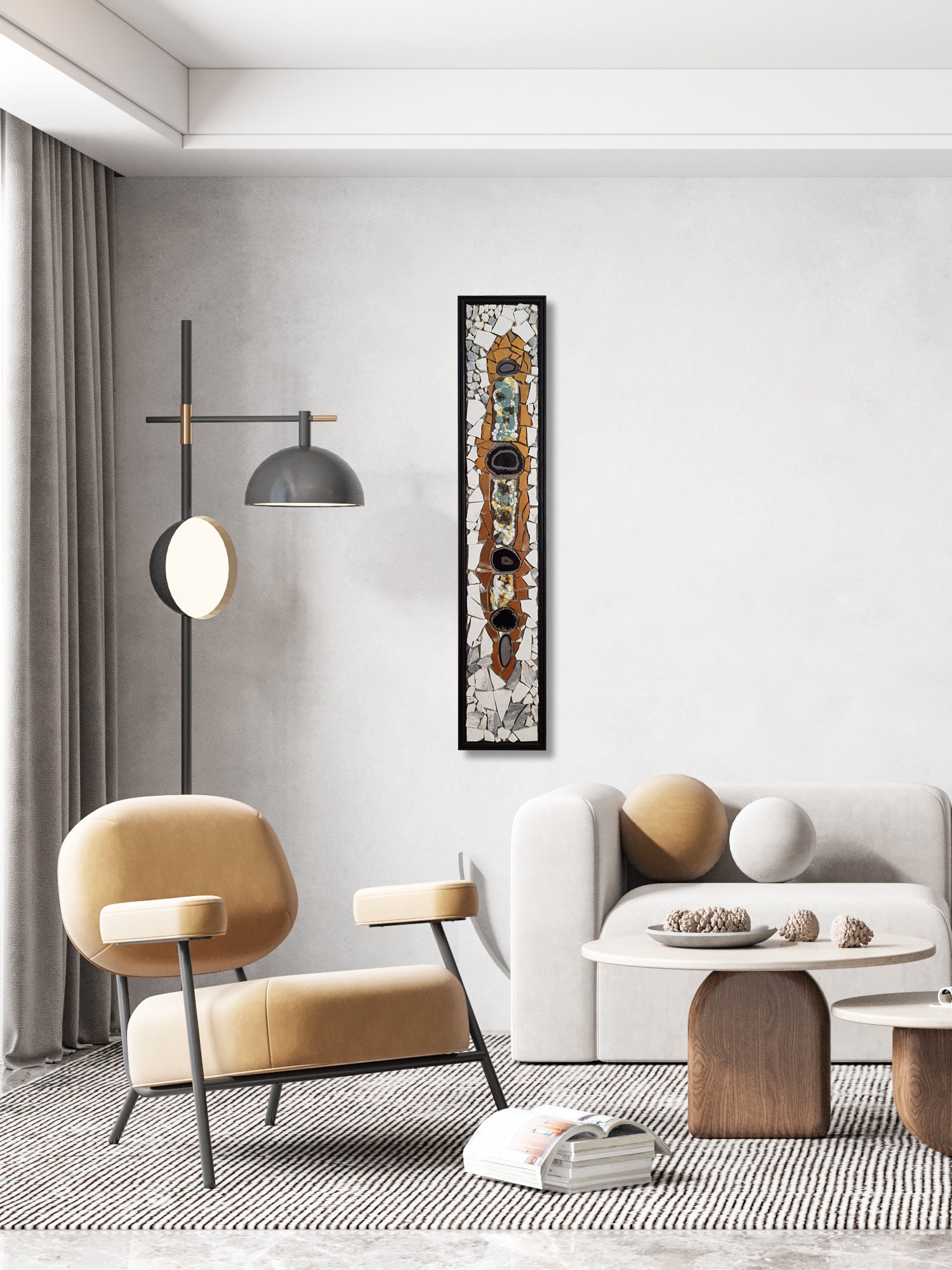 This original wall mosaic relief is one of the latest artworks of the talented Bulgarian contemporary sculptor Ognyan Hristov, deeply inspired by modernism, organic abstraction and zen art. It can be easily adapted to different interior solutions in a wide range of styles. The work has the opportunity to enter into a general composition in both dynamic and calm design spaces. On the other hand, wall mosaics can be displayed appropriately and impressively as stand-alone artworks. Part of the advantage of these works is the conceptual-ideal approach in their conception and creation, also the peculiar treatment of the mosaic in a free way allows for easy adaptation of the works. The abstract-expressive nature of the colors used in the work makes it easily noticeable and enables it to become a strong accent and an attractive visual center in any interior. Their mobility and simple way of hanging makes them easy to maintain and convenient to exhibit and change their location. The materials from which they are made are natural. Another interesting element is the usage of semi-precious stones in the mosaics such as - agate, rhodonite, jasper, etc., as well as enamel, glass, fossils and various types of stone. The work is framed with natural wood, which gives warmth and complements the natural materials used. It is one extraordinary masterpiece and exquisite modern home décor.
