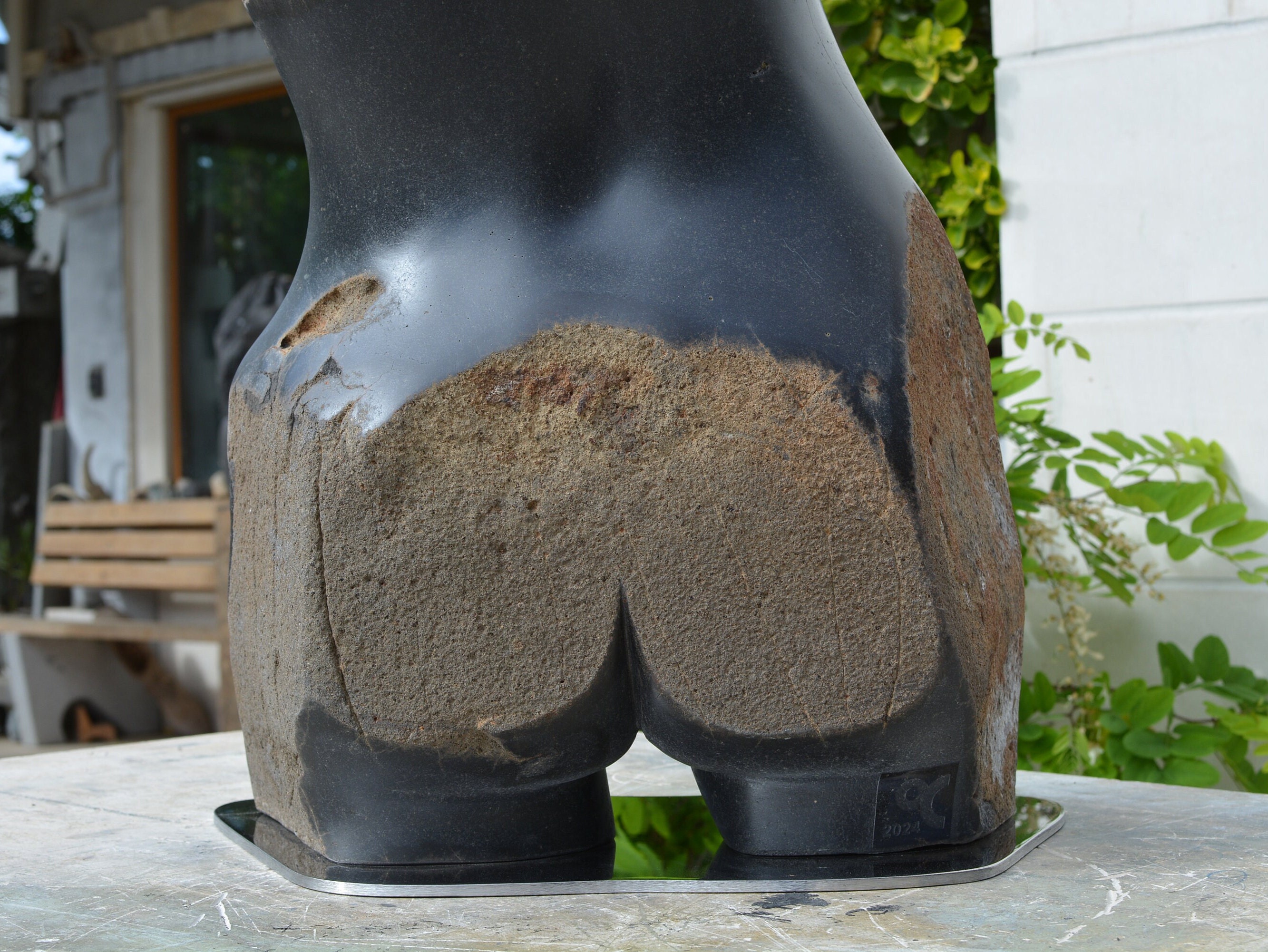 This original basalt sculpture on stainless steel stand is one of the latest artworks of the talented Bulgarian contemporary professional sculptor Ognyan Chitakov. In his creation, he has shaped stone into a tactile female form that celebrates the beauty of curves and the essence of strength. It's an evocation of grace and power, carved with love and respect for the materials. It's not just an object; it's a manifestation of emotion and balance that will invigorate any space with its provocative presence and enduring nature.